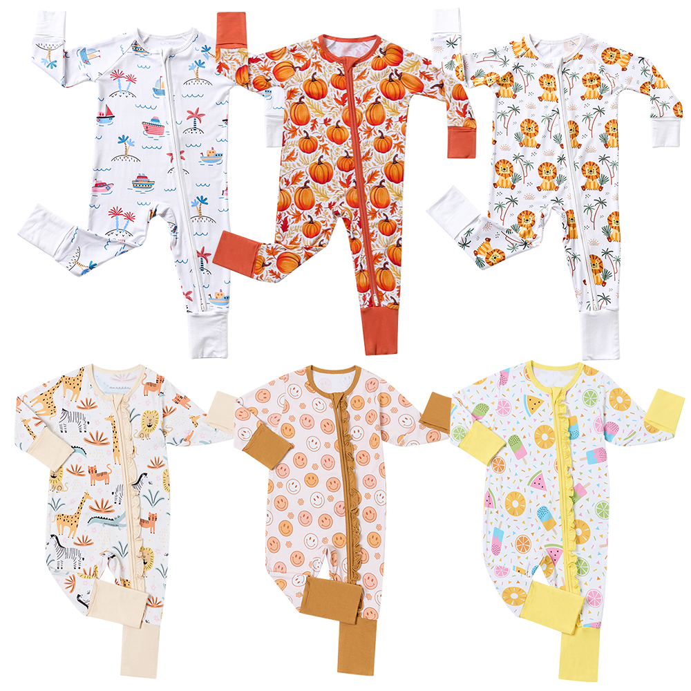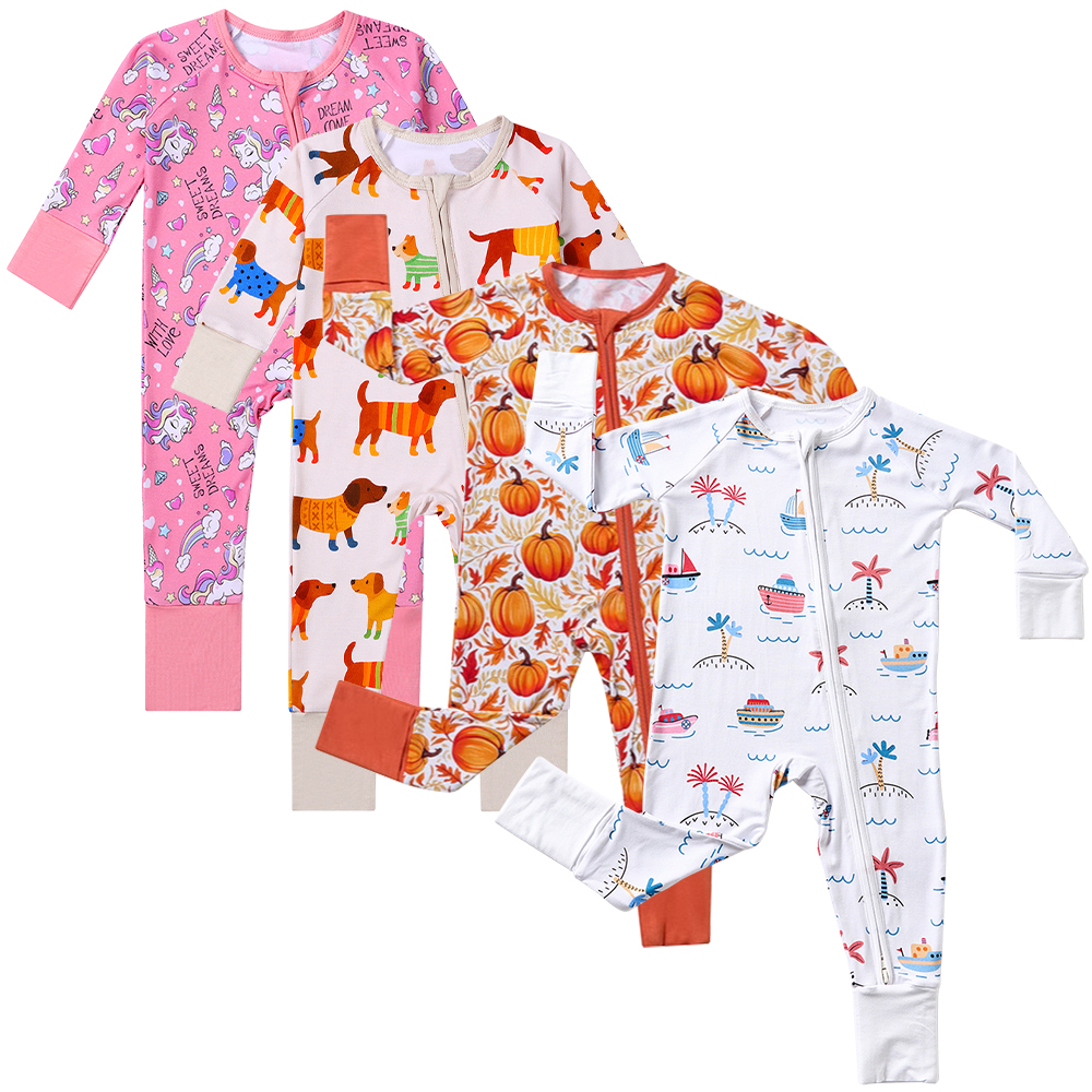 Custom High Quality Baby Clothes 95% Bamboo 5% Spandex Printed Zipper Rompers Printing Pajamas Baby Clothing Bamboo Pajamas
